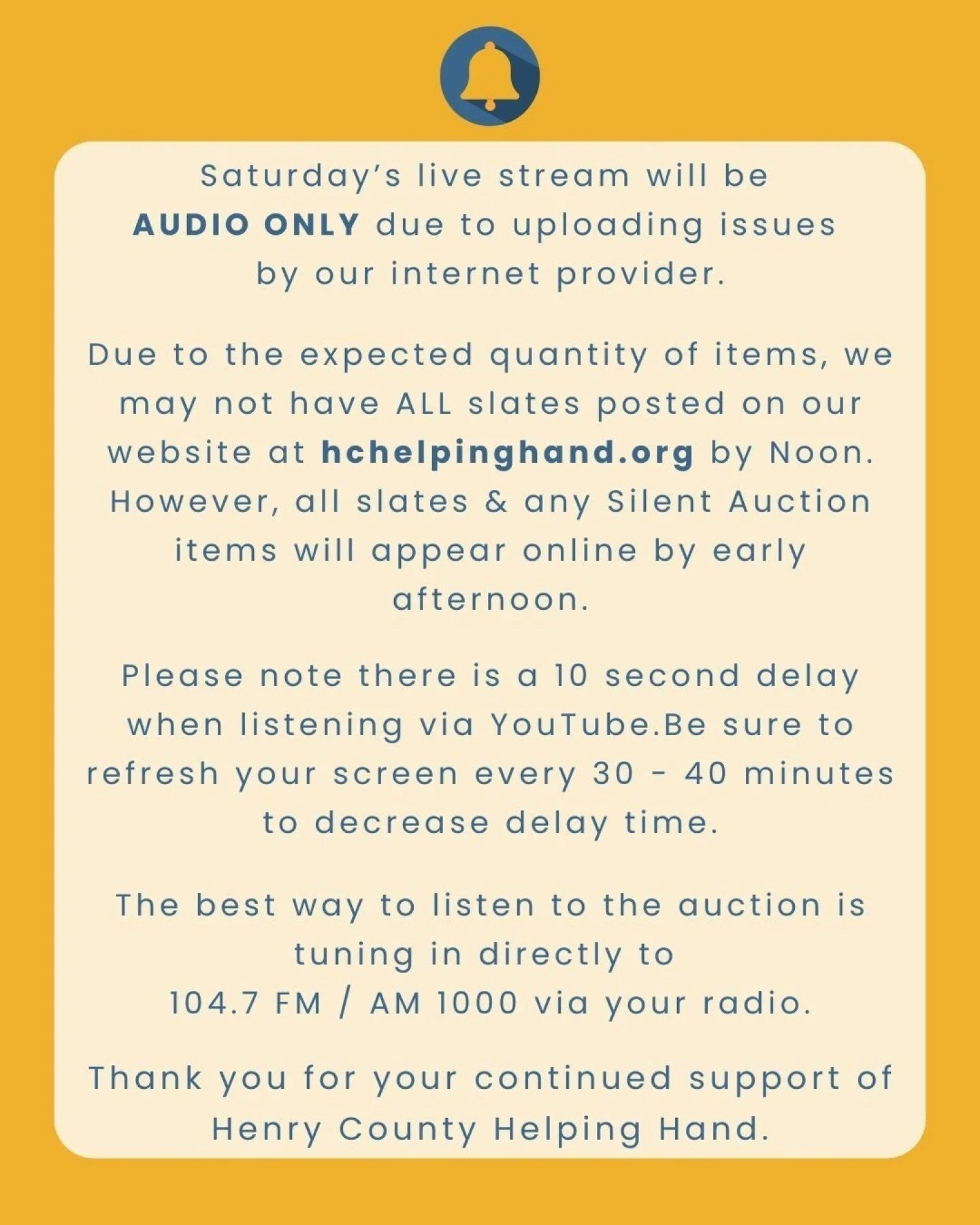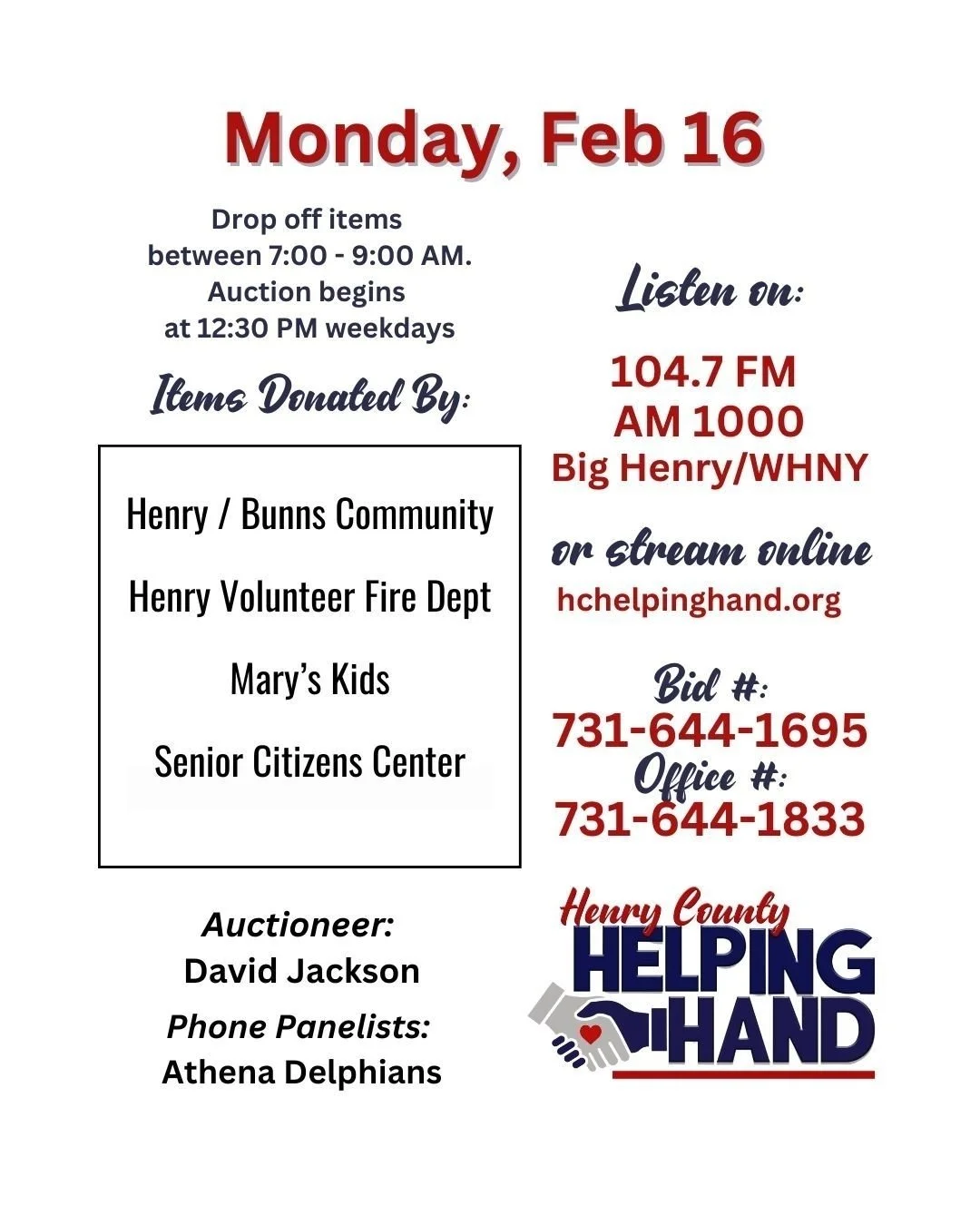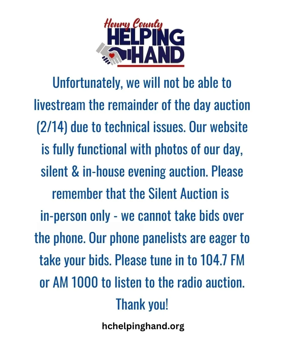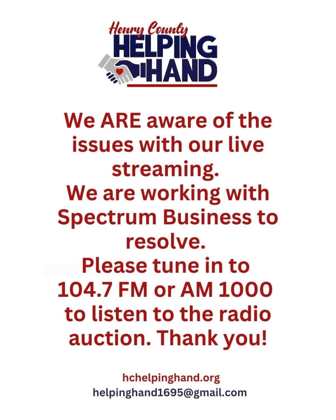 The Helping Hand Radio Auction is an annual community fundraiser in January - early March that keeps 100% of its proceeds in Henry County. Local groups donate items, the community bids live on the radio or in-person, and the funds support nonprofits that strengthen families, serve youth, care for seniors, and meet urgent needs across our county.