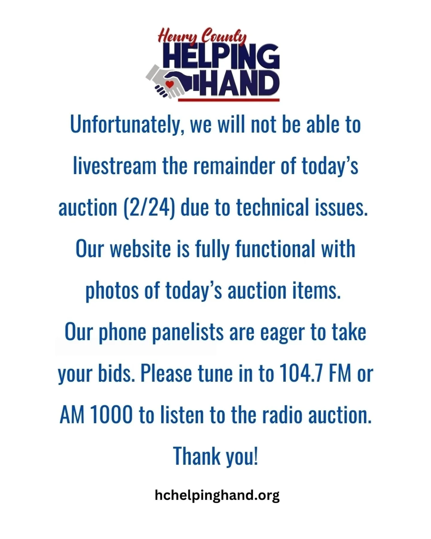 The page you’re looking for isn’t here, but there’s still plenty to explore. Visit our homepage to learn more about the Helping Hand Radio Auction, how it works, and the many ways you can get involved in supporting Henry County.